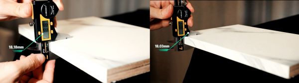 ??【超平面】 ??飾能板飾面系列,通過高溫熱壓方式一體成型,表面平整度極高,厚度誤差在0.15毫米以內(nèi),變形、起泡、碳化、開裂等其他板材常見問題統(tǒng)統(tǒng)say goodbye。 ??我們在任意一塊板材上選擇兩個點,用游標卡尺進行測量,兩個地方的厚度誤差只有0.15毫米,“超平面”就是經(jīng)得起考驗!
