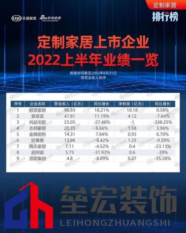 | ??新浪定制家居訊 截至目前,九家上市定制家居企業(yè)已悉數(shù)發(fā)布“2022年上半年度業(yè)績(jī)報(bào)告”,歐派家居以營(yíng)收、凈利潤(rùn)雙料第一穩(wěn)居行業(yè)榜首。