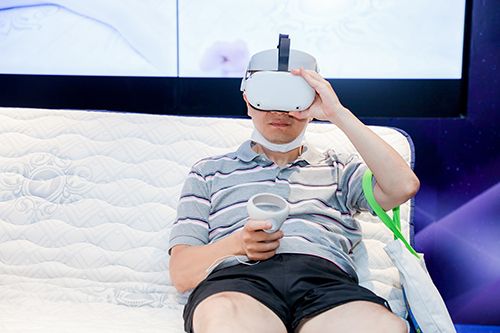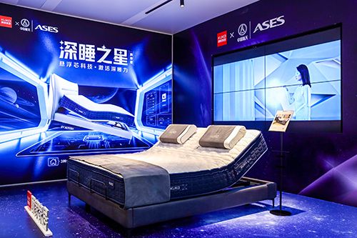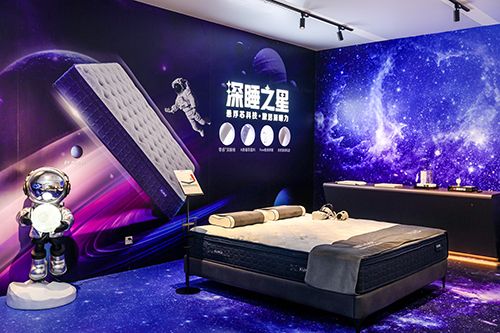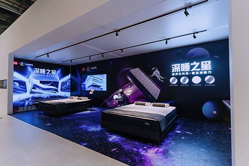 ▲顧家家居深睡之星床墊展區(qū) ??在深睡之星系列床墊展區(qū),與產(chǎn)品名完美契合的場景設計給人帶來身處宇宙星空的震撼之感。在深睡之星科技版體驗專區(qū),顧家家居還配備了專門的VR眼鏡。利用AR虛擬技術,通過融入視覺和聽覺的場景化體驗,參觀者在體驗產(chǎn)品時可以身臨其境感受漫游星河的感覺,在空間的交互與時間的變幻中,真正享受深睡之星科技版的輕懸浮舒壓睡感和自由隨心的智能科技。