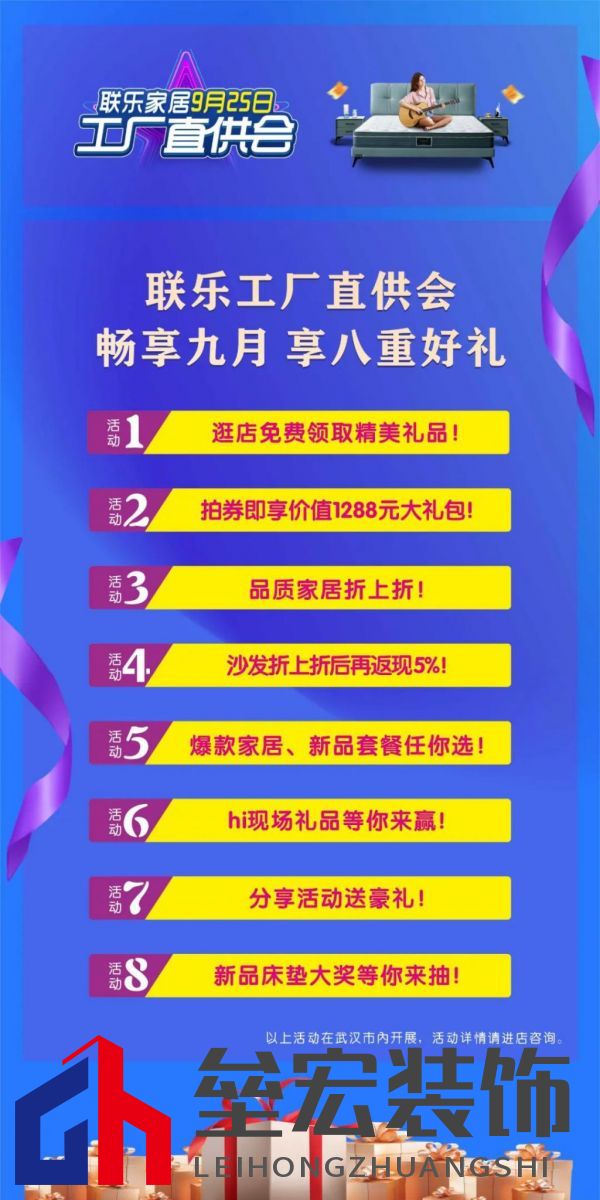 超值家具任意購(gòu) 八重盛惠驚喜連連 2022年9月25日,聯(lián)樂(lè)工廠直供節(jié),八重盛“惠”精彩不斷,福利多多。 【樂(lè)享禮遇】逛店免費(fèi)領(lǐng)取精美禮品 活動(dòng)期間到武漢市內(nèi)任意一家聯(lián)樂(lè)專(zhuān)賣(mài)店,可免費(fèi)領(lǐng)取精美地墊一個(gè)。數(shù)量有限,送完即止。 【樂(lè)享大禮包】29.9 元拍券即享價(jià)值 1288 元大禮包 凡在聯(lián)樂(lè)小程序上以 29.9 元拍到本次活動(dòng)優(yōu)惠券的顧客,即可獲得價(jià)值 1288 元豪華大禮包,包含加厚奶鍋一個(gè)、家居除螨服務(wù)及無(wú)門(mén)檻現(xiàn)金劵。 【樂(lè)享折扣】購(gòu)正價(jià)商品享受折上折 活動(dòng)期間如購(gòu)正價(jià)商品,在正常市場(chǎng)折扣的基礎(chǔ)上再享額外折扣。 【樂(lè)享返現(xiàn)】購(gòu)沙發(fā)折后再返現(xiàn) 活動(dòng)期間購(gòu)聯(lián)樂(lè)床具商品后再購(gòu)買(mǎi)正價(jià)沙發(fā)商品,則正價(jià)沙發(fā)在享受完折上折之后,可再返現(xiàn)。 【樂(lè)享爆款套餐】爆款和套餐限量搶購(gòu) 活動(dòng)期間限量推出多款床具沙發(fā)爆款和套餐,限時(shí)搶購(gòu)。價(jià)格驚艷眼球,搶到就是賺到。 【樂(lè)享 hi 現(xiàn)場(chǎng)】hi 現(xiàn)場(chǎng)贏取獎(jiǎng)品 活動(dòng)當(dāng)天開(kāi)啟多輪 hi 現(xiàn)場(chǎng)游戲互動(dòng),取勝免費(fèi)贏取獎(jiǎng)品,家居用品、電器等享不停。 【樂(lè)享分享禮】分享送豪禮 活動(dòng)期間成交的顧客,總繳款額滿(mǎn)一定金額后,分享指定活動(dòng)內(nèi)容至朋友圈或小區(qū)群,憑截圖可獲家電豪禮。 【樂(lè)享好運(yùn)氣】抽床墊大獎(jiǎng) 活動(dòng)期間成交的顧客可獲抽獎(jiǎng)券參與抽獎(jiǎng),免費(fèi)床墊大獎(jiǎng)等您抽取。