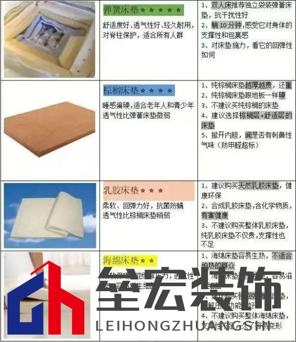 您在家居生活和家居選購(gòu)中,是不是也有這樣那樣的糾結(jié)與苦惱? 其實(shí)這些問(wèn)題也很好解決,小編教您四招輕松選床墊: 1、要選適合自己的,到店體驗(yàn)很關(guān)鍵! 想要選擇一張好的床墊,首先要選擇適合自己體型的。每個(gè)人的脊椎曲線(xiàn)不一樣,睡眠習(xí)慣也不一樣,當(dāng)您平躺在床墊上時(shí),如果臂部沒(méi)有明顯下陷,腰部也沒(méi)有懸空,理論上這個(gè)床墊是適合的。 2、選床墊要明確自身的需求。 哪些是自身的需求呢? 比如年齡段,是青少年睡、中年人睡還是老年人睡,不同年齡段人群對(duì)床墊制作工藝的需求有很大差別。 再如身高體重。比如一個(gè)成年人如果他的體重基數(shù)比較大,選擇太軟的床墊會(huì)導(dǎo)致支撐力不足,睡醒后很有可能腰酸背痛。如果體重偏輕,卻選了一張較硬的床墊,那身體和床墊的貼合面不足,睡眠質(zhì)量也是會(huì)大打折扣的。 再就是要結(jié)合自身身體特點(diǎn)及家庭情況。打個(gè)比方,如果消費(fèi)者是一個(gè)容易過(guò)敏的體質(zhì),就需要考慮床墊是否有防螨抗菌功能,因?yàn)榇矇|一般使用年限比較長(zhǎng)且很難徹底清潔打理,有防螨抗菌功能的床墊可以大大減少過(guò)敏的困擾。另外,買(mǎi)床墊還是要根據(jù)自己實(shí)際購(gòu)買(mǎi)預(yù)算來(lái)選擇,這一點(diǎn)也是非常重要。無(wú)論別人怎么推銷(xiāo),一定找準(zhǔn)自己的定位,千萬(wàn)別交智商稅啊。 3、搞清楚床墊類(lèi)型,看看哪款才是你需要的 選擇床墊,健康環(huán)保非常重要,朝夕相伴的東西,馬虎不得。然后就是選擇床墊類(lèi)型,彈簧床墊、棕櫚床墊、乳膠床墊、海綿床墊,它們各有利弊,小編整理了一張圖,方便大家快速對(duì)比了解!