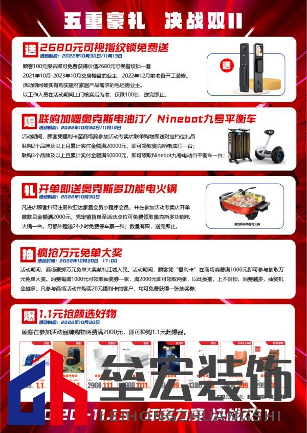 雙十一用實惠的價格和高品質(zhì)家居助力每一個消費者完成家居計劃,展現(xiàn)出歐亞達光谷商場及各大品牌活力,并聯(lián)合裝修工長、知名設計師和新浪家居媒體資源,共同為消費者謀福利,一年一次,值得擁有! 歐亞達光谷商場福利大放送??