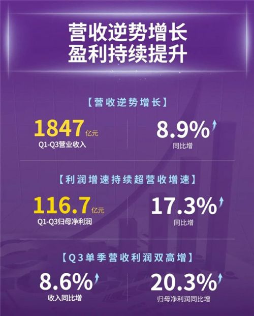 家電賽道競爭模式再變,三翼鳥率先起飛 消費需求的改變,已經(jīng)在影響整個市場。圍繞變化,海爾智家卻以高端品牌、場景品牌、生態(tài)品牌三級品牌戰(zhàn)略布局,實現(xiàn)了跨越市場周期的“逆勢增長?!?/p> 10月30日,海爾智家發(fā)布2022年三季報。財報顯示,海爾智家前三季度實現(xiàn)營業(yè)收入1847億元,較2021年同期增長8.9%;實現(xiàn)歸母凈利潤116.7億元,較2021年同期增長17.3%;利潤增幅兩倍于收入增幅;第三季度單季度收入增長8.6%,歸母凈利潤增長20.3%,單季度表現(xiàn)出很強的經(jīng)營韌性。