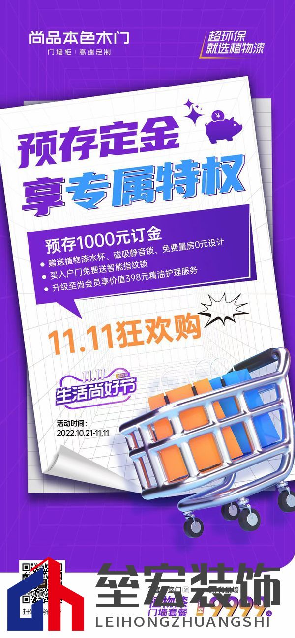 ??尚品本色雙11生活尚好節(jié)以滿滿誠意,為消費者帶來一系列驚喜福利,線下消費者進入門店即可直接領(lǐng)取精品水杯,預(yù)存100元定金即可享五重專屬特權(quán),植物漆水杯、靜音鎖、智能指紋鎖,免費量房、0元設(shè)計,精油護理服務(wù)下定直接送,福利滿滿,驚喜超多。