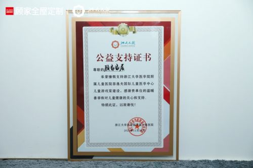 ??此次顧家家居對于醫(yī)院游戲室的公益支持打造以及公益關愛行動,獲得了醫(yī)院的認可,也受到小朋友們及家長的歡迎,并榮獲浙江大學醫(yī)學院附屬兒童醫(yī)院頒發(fā)的感謝證書。