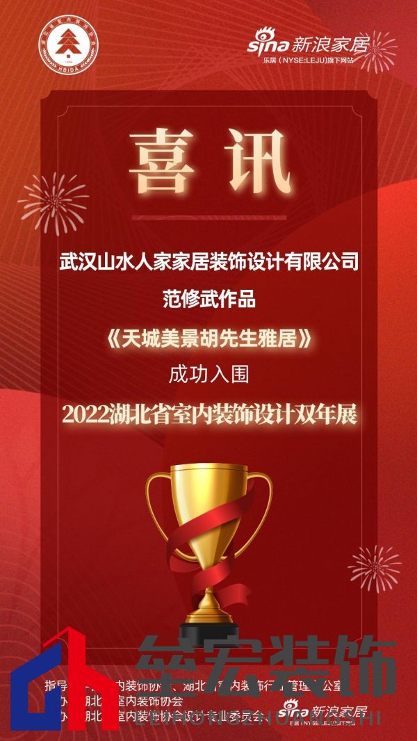 | 綠色設計,大美荊楚,由中國室內裝飾協(xié)會、湖北省室內裝飾行業(yè)管理辦公室的指導,湖北省室內裝飾協(xié)會主辦的2022湖北室內裝飾設計雙年展,在室內裝飾設計行業(yè)打造了一場全省范圍的設計盛會,首輪評選百余套作品,70余套優(yōu)秀作品成功入圍。 在智能化、人文化、健康舒適化的時代趨勢下,雙年展的舉辦,以新時代、新理念、新創(chuàng)意,提升室內裝飾設計水平,為設計師進行品牌賦能,弘揚荊楚設計精神與風貌。針對這項有權威性、有知名度的專業(yè)賽事,武漢各大裝飾公司及設計工作室積極響應,因為參加雙年展對設計師開拓視野、加強行業(yè)交流、提升專業(yè)水平具有重要意義。 雙年展專家組評委秉承公正公平、優(yōu)中選優(yōu)的原則,經(jīng)過層層篩選,初評結果現(xiàn)已出爐。 設計滋養(yǎng)生活,生活反哺設計,優(yōu)秀的作品,總是離不開對藝術矢志不移的熱情與探索,以及對美與愛的深度感知,雙年展入圍作品均對此進行了完美的詮釋。 武漢山水人家家居裝飾設計有限公司設計師范修武原創(chuàng)作品《天城美景胡先生雅居》,成功入圍2022湖北省室內裝飾設計雙年展,以獨特的設計風格,和優(yōu)秀的設計能力,展示設計理念和創(chuàng)意。