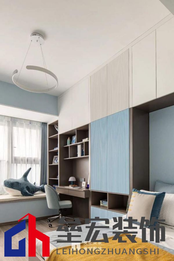 ??海洋主題的兒童房,以淡藍(lán)色為主調(diào)將床頭、衣柜、書桌、飄窗連接為一個整體。充滿童趣的空間帶給孩子無盡的想象。