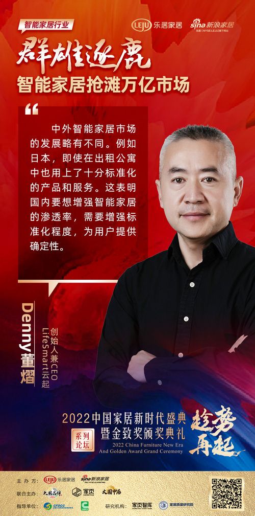| 新浪家居智能家居頻道獨家報道 2022年12月23日,新浪家居舉辦“趁勢?再起——2022中國家居新時代盛典暨金致獎頒獎典禮”系列論壇,其中智能家居行業(yè)特別舉辦“群雄逐鹿——智能家居搶灘萬億市場”線上分論壇。KNX協(xié)會中國區(qū)代表何檢、LifeSmart云起創(chuàng)始人兼CEO Denny董熠、摩根全屋智能戰(zhàn)略事業(yè)部總經(jīng)理胡先華、盈趣智能副總經(jīng)理林軍等幾位行業(yè)參與者一起論道智能家居,描繪行業(yè)未來發(fā)展圖譜。 LifeSmart云起創(chuàng)始人兼CEO Denny董熠表示,中外智能家居市場的發(fā)展略有不同。例如日本,即使在出租公寓中也用上了十分標(biāo)準(zhǔn)化的產(chǎn)品和服務(wù)。這表明國內(nèi)要想增強智能家居的滲透率,需要增強標(biāo)準(zhǔn)化程度,為用戶提供確定性。