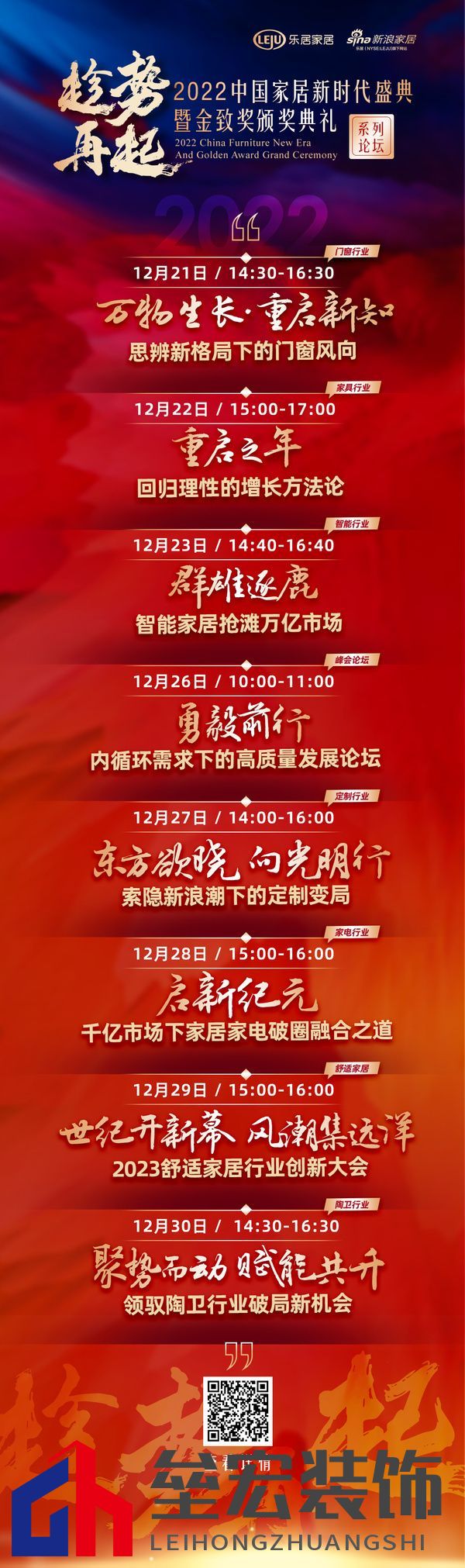 ??新浪家居訊 由樂(lè)居家居主辦,新浪家居承辦,大國(guó)品牌、家頁(yè)智庫(kù)、大國(guó)中居聯(lián)合主辦的『趁勢(shì)·再起——2022中國(guó)家居新時(shí)代盛典暨金致獎(jiǎng)?lì)C獎(jiǎng)典禮』將于12月26日在云端盛大開幕。 ??作為家居業(yè)界中首屈一指的年度盛會(huì),本次活動(dòng)以“趁勢(shì)·再起”為主題,內(nèi)容囊括行業(yè)思想盛宴、「2022十大家居事件」發(fā)布、經(jīng)濟(jì)學(xué)家馬光遠(yuǎn)教授主題演講以及2022年度多項(xiàng)榜單揭曉等重磅環(huán)節(jié),寄托著中國(guó)家居人步履不停,迎難而上,奮發(fā)拼搏的昂揚(yáng)精神,盛會(huì)在對(duì)2022年家居行業(yè)進(jìn)行年度復(fù)盤的同時(shí),還協(xié)邀了諸多專家學(xué)者與行業(yè)精英,共同聚焦家居行業(yè)新時(shí)期下的高質(zhì)量發(fā)展,萃取家居行業(yè)同仁智慧,凝聚家居行業(yè)各方力量,一道探尋行業(yè)在新局勢(shì)下的發(fā)展之道。 ??“回眸過(guò)往、展望未來(lái)”,『2022中國(guó)家居新時(shí)代盛典』將以“信心、融合、共贏、高質(zhì)量發(fā)展”為關(guān)鍵詞,匯聚行業(yè)領(lǐng)袖及專家學(xué)者,把脈發(fā)展動(dòng)向,共話大變局下的可持續(xù)發(fā)展之道,以信念加持行動(dòng),推動(dòng)行業(yè)持續(xù)發(fā)展,助力國(guó)家經(jīng)濟(jì)有序復(fù)蘇。 ??此外,從12月21日到12月30日,『趁勢(shì)·再起——2022中國(guó)家居新時(shí)代盛典暨金致獎(jiǎng)?lì)C獎(jiǎng)典禮』系列主題論壇也將陸續(xù)上線,行業(yè)涵蓋陶衛(wèi)、舒適、智能、家電、定制、門窗、家具等共計(jì)8場(chǎng)論壇,以細(xì)分品類市場(chǎng)現(xiàn)存痛點(diǎn)為核心展開,匯聚行業(yè)大咖,共同探究大環(huán)境下家居企業(yè)的高質(zhì)量發(fā)展之路。