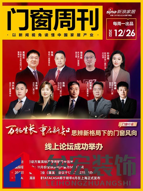 ??“萬物生長 重啟新知——思辨新格局下的門窗風向”線上論壇成功舉辦 ??12月21日,新浪家居特別舉辦“趁勢 ? 再起——2023中國家居新時代盛典暨金致獎頒獎典禮”系列論壇,“萬物生長 重啟新知——思辨新格局下的門窗風向”線上論壇,邀約四川省門窗行業(yè)協(xié)會會長陳剛、博仕門窗董事長王湘根、維朗門窗董事長張偉、沃倫門窗CEO車曉娜、美沃門窗董事長洪長林、良木道門窗集團副總裁駱吉彬、華建鋁業(yè)格溫特門窗董事長吳維云等一眾中國門窗行業(yè)優(yōu)秀企業(yè)家,重新思考、辨別行業(yè)發(fā)展,探尋新的增長曲線。 ??查看詳情:共襄高質(zhì)量發(fā)展,門窗大咖云端思辨行業(yè)新風向