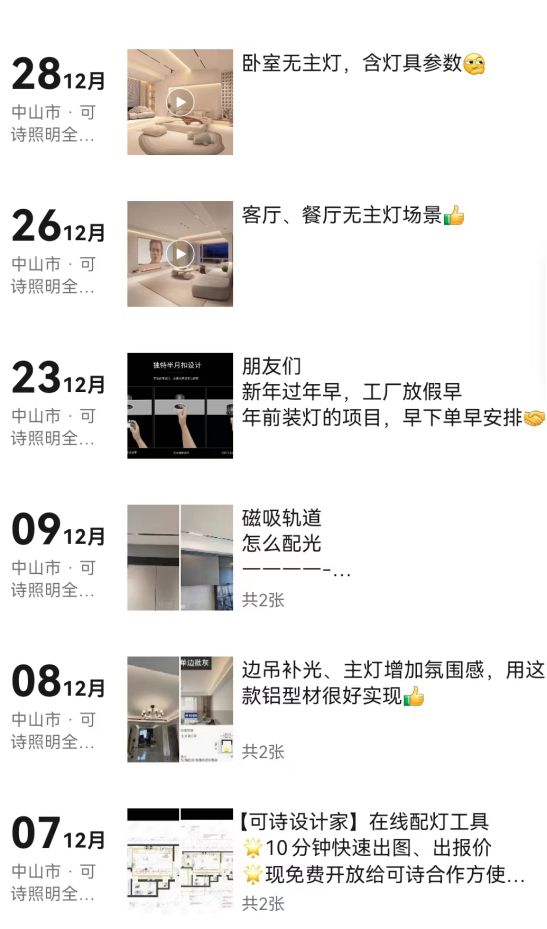 ??三、內(nèi)容賦能 ??新媒體共享內(nèi)容素材 ??KESHI可詩照明在小紅書、抖音、嗶哩嗶哩、快手等新媒體渠道強勢布局,累計吸粉超100W+。無論是官方號還是燈光設(shè)計師矩陣號,都持續(xù)產(chǎn)出能促進(jìn)產(chǎn)品轉(zhuǎn)化的爆文、精品文,內(nèi)容素材涵蓋圖片、視頻、文章等多種形式。KESHI可詩照明與合作伙伴共享新媒體內(nèi)容素材,愿助力合作方有方向性地實現(xiàn)高質(zhì)量的朋友圈內(nèi)容營銷。