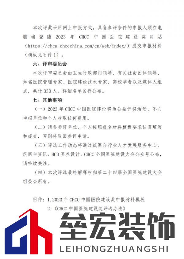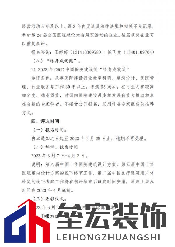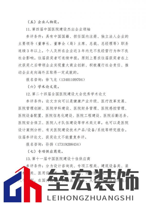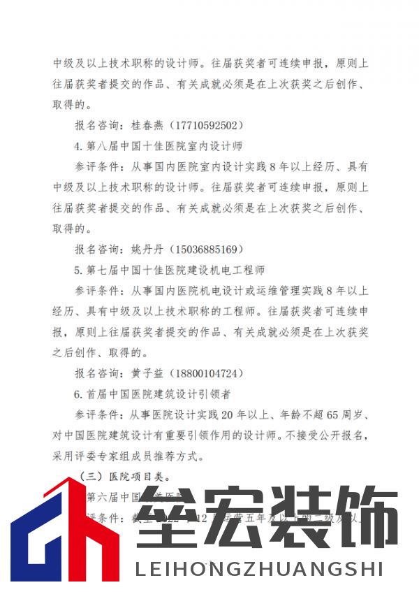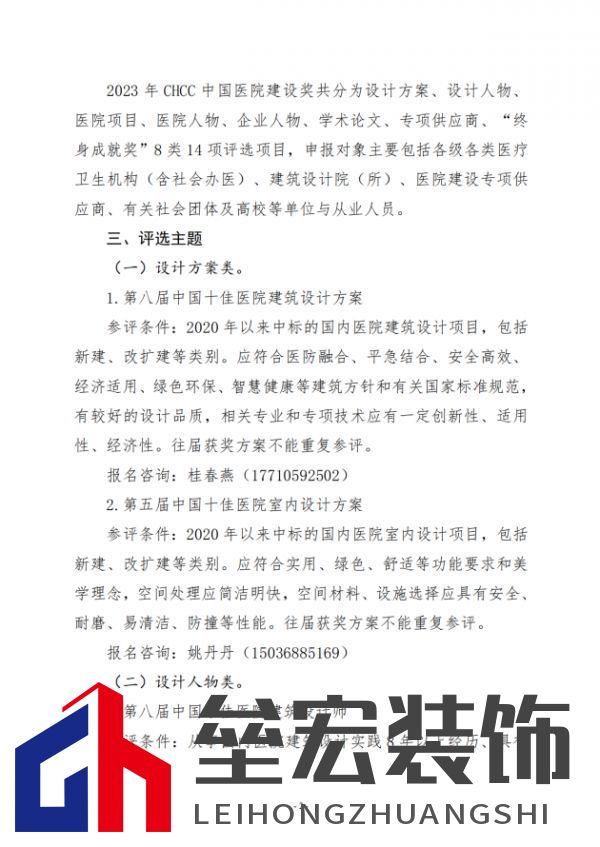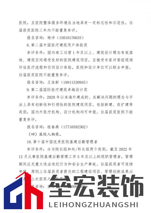 | 為深入貫徹落實《國務(wù)院辦公廳關(guān)于推動公立醫(yī)院高質(zhì)量發(fā)展的意見》(國辦發(fā)〔2021〕18號),加快推進(jìn)深化醫(yī)改目標(biāo)任務(wù),進(jìn)一步鞏固深化我國醫(yī)院建設(shè)成果和推動美好醫(yī)院創(chuàng)建,全面發(fā)掘、表彰在醫(yī)院基本建設(shè)和后勤保障方面的先進(jìn)單位、個人、項目、企業(yè),由第二十四屆全國醫(yī)院建設(shè)大會組委會、筑醫(yī)臺、筑而瑞、北京建筑大學(xué)主辦的“2023年CHCC中國醫(yī)院建設(shè)獎”評選活動正式啟動。現(xiàn)將相關(guān)事項通知如下: 一、組織機(jī)構(gòu) 主辦機(jī)構(gòu) 第二十四屆全國醫(yī)院建設(shè)大會組委會、筑醫(yī)臺、筑而瑞、北京建筑大學(xué) 聯(lián)合主辦 東南大學(xué)建筑學(xué)院、華南理工大學(xué)建筑學(xué)院、重慶大學(xué)建筑城規(guī)學(xué)院、哈爾濱工業(yè)大學(xué)建筑學(xué)院、西安建筑科技大學(xué)建筑學(xué)院 二、評選范圍 2023年CHCC中國醫(yī)院建設(shè)獎共分為設(shè)計方案、設(shè)計人物、醫(yī)院項目、醫(yī)院人物、企業(yè)人物、學(xué)術(shù)論文、專項供應(yīng)商、“終身成就獎”8類14項評選項目,申報對象主要包括各級各類醫(yī)療衛(wèi)生機(jī)構(gòu)(含社會辦醫(yī))、建筑設(shè)計院(所)、醫(yī)院建設(shè)專項供應(yīng)商、有關(guān)社會團(tuán)體及高校等單位與從業(yè)人員。 三、評選主題 (一)設(shè)計方案類。 1.第八屆中國十佳醫(yī)院建筑設(shè)計方案 參評條件:2020年以來中標(biāo)的國內(nèi)醫(yī)院建筑設(shè)計項目,包括新建、改擴(kuò)建等類別。應(yīng)符合醫(yī)防融合、平急結(jié)合、安全高效、經(jīng)濟(jì)適用、綠色環(huán)保、智慧健康等建筑方針和有關(guān)國家標(biāo)準(zhǔn)規(guī)范,有較好的設(shè)計品質(zhì),相關(guān)專業(yè)和專項技術(shù)應(yīng)有一定創(chuàng)新性、適用性、經(jīng)濟(jì)性。往屆獲獎方案不能重復(fù)參評。 報名咨詢:桂春燕(17710592502) 2.第五屆中國十佳醫(yī)院室內(nèi)設(shè)計方案 參評條件:2020年以來中標(biāo)的國內(nèi)醫(yī)院室內(nèi)設(shè)計項目,包括新建、改擴(kuò)建等類別。應(yīng)符合實用、綠色、舒適等功能要求和美學(xué)理念,空間處理應(yīng)簡潔明快,空間材料、設(shè)施選擇應(yīng)具有安全、耐磨、易清潔、防撞等性能。往屆獲獎方案不能重復(fù)參評。 報名咨詢:姚丹丹(15036885169) (二)設(shè)計人物類。 3.第八屆中國十佳醫(yī)院建筑設(shè)計師 參評條件:從事國內(nèi)醫(yī)院建筑設(shè)計實踐8年以上經(jīng)歷、具有中級及以上技術(shù)職稱的設(shè)計師。往屆獲獎?wù)呖蛇B續(xù)申報,原則上往屆獲獎?wù)咛峤坏淖髌?、有關(guān)成就必須是在上次獲獎之后創(chuàng)作、取得的。 報名咨詢:桂春燕(17710592502) 4.第八屆中國十佳醫(yī)院室內(nèi)設(shè)計師 參評條件:從事國內(nèi)醫(yī)院室內(nèi)設(shè)計實踐8年以上經(jīng)歷、具有中級及以上技術(shù)職稱的設(shè)計師。往屆獲獎?wù)呖蛇B續(xù)申報,原則上往屆獲獎?wù)咛峤坏淖髌贰⒂嘘P(guān)成就必須是在上次獲獎之后創(chuàng)作、取得的。 報名咨詢:姚丹丹(15036885169) 5.第七屆中國十佳醫(yī)院建設(shè)機(jī)電工程師 參評條件:從事國內(nèi)醫(yī)院機(jī)電設(shè)計或運維管理實踐8年以上經(jīng)歷、具有中級及以上技術(shù)職稱的工程師。往屆獲獎?wù)呖蛇B續(xù)申報,原則上往屆獲獎?wù)咛峤坏淖髌?、有關(guān)成就必須是在上次獲獎之后創(chuàng)作、取得的。 報名咨詢:黃子益(18800104724) 6.首屆中國醫(yī)院建筑設(shè)計引領(lǐng)者 參評條件:從事醫(yī)院設(shè)計實踐20年以上、年齡不超65周歲、對中國醫(yī)院建筑設(shè)計有重要引領(lǐng)作用的設(shè)計師。不接受公開報名,采用評委專家組成員推薦方式。 (三)醫(yī)院項目類。 7.第六屆中國最美醫(yī)院 參評條件:截至2022年12月運營五年及以上的二級及以上醫(yī)院,且醫(yī)院整體服務(wù)環(huán)境在當(dāng)?shù)鼐哂幸欢?biāo)志性和示范性,往屆獲獎醫(yī)院三年內(nèi)不能重復(fù)參評。 報名咨詢:楊洋(15010176635) 8.第二屆中國醫(yī)療建筑用戶體驗獎 參評條件:國內(nèi)竣工運營1年及以上、建筑設(shè)計理念有效落地、建筑空間感受良好的醫(yī)院建筑項目,且接受專家評委組現(xiàn)場評估醫(yī)療流程和空間設(shè)計體驗,醫(yī)院和設(shè)計單位可以聯(lián)合申報。往屆獲獎醫(yī)院不能重復(fù)參評。 報名咨詢:王佳新(18811530945) 9.第二屆國際醫(yī)療建筑卓越設(shè)計獎 參評條件:2020年以來海外建成的、在解決問題的理念與手法上具有創(chuàng)新性和引領(lǐng)性的醫(yī)院建筑項目,包括新建、改擴(kuò)建等類別,國內(nèi)外醫(yī)療機(jī)構(gòu)、設(shè)計機(jī)構(gòu)均可申報。往屆獲獎醫(yī)院不能重復(fù)參評。 報名咨詢:桂春燕(17710592502) (四)醫(yī)院人物獎。 10.第十屆中國優(yōu)秀醫(yī)院基建后勤管理者 參評條件:分為院長組和處/科長組兩個類別。截至2022年12月從事醫(yī)院基建后勤管理工作5年及以上的現(xiàn)職管理者,管理期間應(yīng)無重大違法違紀(jì)行為和安全生產(chǎn)事故。往屆獲獎?wù)呖蛇B續(xù)申報,原則上往屆獲獎?