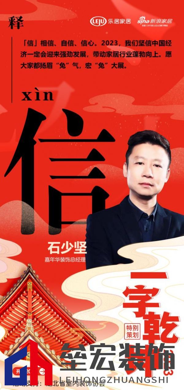 在新浪家居“2023一字乾坤”活動中,嘉年華裝飾總經(jīng)理石少堅:「信」相信、自信、信心。2023,我們堅信中國經(jīng)濟一定會迎來強勁發(fā)展,帶動家居行業(yè)蓬勃向上。愿大家都揚眉“兔”氣,宏“兔”大展。 “以漢字賦能湖北家居企業(yè),彰顯厚積薄發(fā)之力”,以單字抒寫了各家企業(yè)及媒體的新年愿景與發(fā)展信條,領(lǐng)略楚風漢韻下湖北家居人砥礪向前,揚帆未來的決心與動力,情暖兔歲,新啟華章。 |