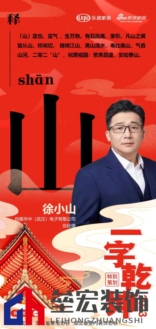 在新浪家居“2023一字乾坤”活動中,創(chuàng)維華中(武漢)電子有限公司總經理徐小山:「山」宣也。宣氣,生萬物。有石而高,象形。凡山之屬皆從山。所閑切。 錦繡江山,高山流水,壽比南山、氣吞山河。二零二“山”,祝愿祖國:繁榮昌盛,安如泰山。 “以漢字賦能湖北家居企業(yè),彰顯厚積薄發(fā)之力”,以單字抒寫了各家企業(yè)及媒體的新年愿景與發(fā)展信條,領略楚風漢韻下湖北家居人砥礪向前,揚帆未來的決心與動力,情暖兔歲,新啟華章。 |