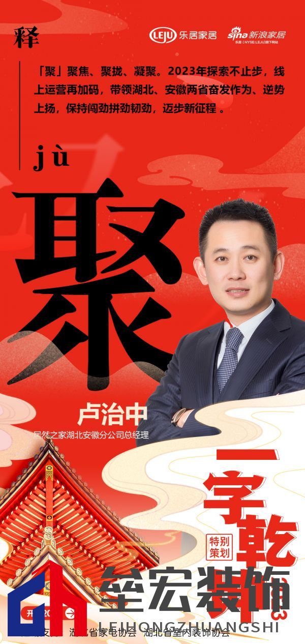 在新浪家居“2023一字乾坤”活動中,居然之家湖北安徽分公司總經(jīng)理盧治中:「聚」聚焦、聚攏、凝聚。2023年探索不止步,線上運營再加碼,帶領(lǐng)湖北、安徽兩省奮發(fā)作為、逆勢上揚,保持闖勁拼勁韌勁,邁步新征程 。 “以漢字賦能湖北家居企業(yè),彰顯厚積薄發(fā)之力”,以單字抒寫了各家企業(yè)及媒體的新年愿景與發(fā)展信條,領(lǐng)略楚風(fēng)漢韻下湖北家居人砥礪向前,揚帆未來的決心與動力,情暖兔歲,新啟華章。 |