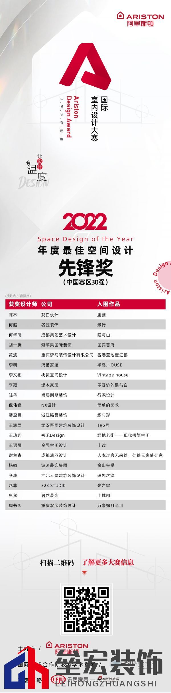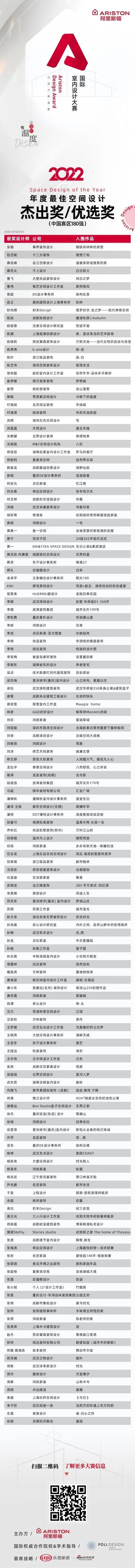 ??2022年7月,由米蘭理工大學(xué)POLI.design設(shè)計(jì)學(xué)院全程指導(dǎo),由有著92年歷史的意大利知名企業(yè)阿里斯頓集團(tuán)攜手新浪家居共同打造的Ariston Design Award 國(guó)際室內(nèi)設(shè)計(jì)大賽在上海正式啟動(dòng)。經(jīng)過(guò)5個(gè)月的作品征集及90天海選、初復(fù)評(píng),180份作品入圍終審,爭(zhēng)奪本次大賽年度最佳空間設(shè)計(jì)金獎(jiǎng)、年度最佳空間設(shè)計(jì)先鋒獎(jiǎng)、可持續(xù)設(shè)計(jì)獎(jiǎng)、大區(qū)杰出獎(jiǎng)等多個(gè)獎(jiǎng)項(xiàng)。入圍名單已在2023年1月17日對(duì)外公示。 ??2023年1月28日-2月25日,在經(jīng)過(guò)6位專業(yè)評(píng)委近1個(gè)月嚴(yán)格的終審后,最終本屆Ariston Design Award 中國(guó)賽區(qū)各級(jí)獎(jiǎng)項(xiàng)結(jié)果出爐! Ariston Design Award 中國(guó)賽區(qū)各級(jí)獎(jiǎng)項(xiàng)獲獎(jiǎng)名單 年度最佳空間設(shè)計(jì)金獎(jiǎng)(中國(guó)賽區(qū)10強(qiáng)) 年度最佳空間設(shè)計(jì)先鋒獎(jiǎng)(中國(guó)賽區(qū)30強(qiáng))