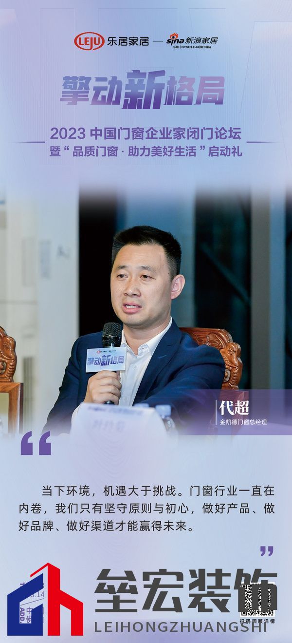 ??金凱德門窗總經(jīng)理代超:當(dāng)下環(huán)境,機遇大于挑戰(zhàn)。門窗行業(yè)一直在內(nèi)卷,我們只有堅守原則與初心,做好產(chǎn)品、做好品牌、做好渠道才能贏得未來。 |