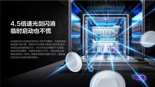 ??在最新推出的光劍消毒柜XS827上搭載了光動(dòng)力低溫快消科技,機(jī)身頂部和背部搭載雙渦旋速烘技術(shù),配合電熱加熱管,輸出中低溫環(huán)繞式循環(huán)熱風(fēng),平均烘干溫度只有50℃,這使得寶貝的奶瓶、牙膠等等這些重要的小物件都不會(huì)被高溫灼傷,從此可以放心消毒了。且消毒烘干全流程只需40分鐘,遠(yuǎn)低于120-180分鐘的高溫消毒和90-150分鐘的臭氧+紫外線消毒,這使得大多數(shù)家庭在烹飪前臨時(shí)啟動(dòng)消毒柜,也不會(huì)耽誤享用美食。
