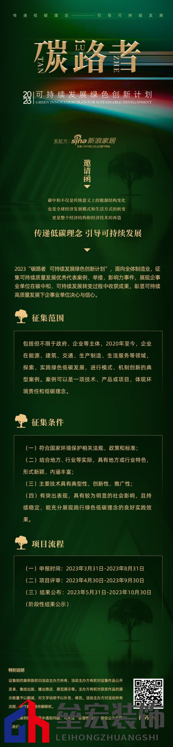 ??啟動儀式上,新浪家居主編陳婉璟女士對“碳路者 2023可持續(xù)發(fā)展綠色創(chuàng)新計劃”的申報流程、相關(guān)規(guī)則進(jìn)行了講解。此次新浪家居“碳路者 可持續(xù)發(fā)展綠色創(chuàng)新計劃”征集范圍,包括但不限于政府、企業(yè)等主體,2020年至今在能源、建筑、交通、生產(chǎn)制造、生活服務(wù)等領(lǐng)域,探索、實踐綠色低碳發(fā)展,進(jìn)行模式、機(jī)制創(chuàng)新的典型案例。案例可以是一項技術(shù)、產(chǎn)品或項目,體現(xiàn)環(huán)境責(zé)任和低碳理念。申報時間從2023年3月1日到2023年8月31日,結(jié)果將在2023年5月31日-2023年10月30日期間,陸續(xù)公布。申報單位可以關(guān)注家居情報站微信公眾號回復(fù)“低碳案例征集”獲取報名表下載并填寫相關(guān)內(nèi)容,加上影像圖片等附件資料,以“××單位綠色低碳案例”為郵件名,將申報材料打包發(fā)送至郵箱:158418735@qq.com進(jìn)行報名,也可以通過掃描下方圖片二維碼在線提報報名。