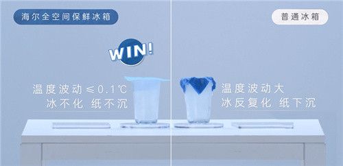 冷凍室溫度是否波動(dòng),是造成兩張餐巾紙巨大差異的主要原因。海爾全空間保鮮冰箱的冷凍溫度波動(dòng)≦0.1°C,冰杯不會(huì)反復(fù)化凍,紙巾始終干燥;而普通冰箱冷凍溫度波動(dòng)大、溫差大,所以導(dǎo)致冰塊反復(fù)化凍,紙巾浸濕下沉。