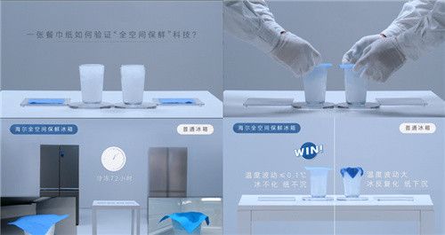視頻中,實(shí)驗(yàn)人員將餐巾紙放在兩杯相同的冰上,并分別放入海爾全空間保鮮冰箱和普通冰箱中。經(jīng)過(guò)72小時(shí)的冷凍,從海爾全空間保鮮冰箱中拿出的餐巾紙依舊平整如初;而普通冰箱里的餐巾紙已被浸濕,覆蓋在杯口的部分明顯下沉。