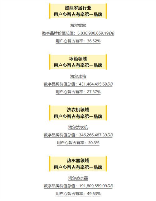| 伴隨著農(nóng)耕取代狩獵采集,人類開始定居生活,自此有了家的概念。古之民“陵阜而居,穴而處”,刻著簡陋壁畫的洞穴就是他們的家;杜甫盼望“得廣廈千萬間”,不為秋風所破的茅屋就是他的家;劉禹錫喜歡“調(diào)素琴、閱金經(jīng)”,一間陋室便是他的家;陶淵明“心遠地自偏”,車馬喧囂的地方也能定居安家。 到了現(xiàn)代,人們對“家”有了更具象的概念,對美好生活的向往,無不體現(xiàn)在對家的種種設(shè)想上。從House到Home的躍遷,既包含了每個人對何謂舒適、溫馨、安全的個性化定義,也離不開科技為基座的硬核加持。2015年,海爾智家就在行業(yè)內(nèi)率先提出“智慧家庭”的愿景和戰(zhàn)略,這是一家企業(yè)與用戶所凝聚的高度共識:既有這家全球化企業(yè)多年來對智慧家庭的深度理解和趨勢引領(lǐng),也是用戶對未來之家的主流期待和場景想象。 時間終會獎勵辛勤耕作者。在『數(shù)字品牌榜』發(fā)布的2022年DBRank100:數(shù)字品牌價值年度榜上,海爾智家以58億DB成為智能家居行業(yè)用戶心智占有率第一品牌,在該行業(yè)內(nèi)的用戶心智占有率高達36.52%,超過了美的(18.49%)+格力(11.95%)+方太(2.49%)+三星(2.39%)+LG(0.49%)+博西家電(0.44%)等多個也在該方向發(fā)力的中外企業(yè)——榜女郎溫馨提醒一下:這不是對“家電企業(yè)”的評價,而是反映了在用戶心目中誰才是“最智慧家庭”品牌的認知。 同時,海爾智家也在冰箱、洗衣機、熱水器等多個細分領(lǐng)域內(nèi),獲得用戶心智占有率第一品牌的位置。如下: