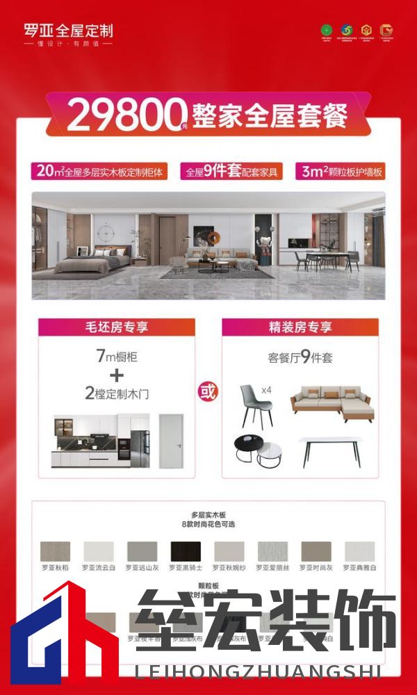 29800元整家全屋套餐,毛坯/精裝一口價(jià)配齊 相比于市場(chǎng)上同類(lèi)套餐,購(gòu)買(mǎi)羅亞全屋定制柜/護(hù)墻板/定制木門(mén),實(shí)現(xiàn)流行的柜墻門(mén)一體化設(shè)計(jì),僅需29800元一價(jià)配齊,極具“質(zhì)價(jià)比+心價(jià)比”優(yōu)勢(shì);同時(shí),柜墻門(mén)一體化搭配,無(wú)需操勞奔波建材市場(chǎng)每家比較,也不用擔(dān)心花色、風(fēng)格、售后服務(wù)沖突等一系列煩事,省時(shí)又省心。此外,該套餐分別針對(duì)毛坯房和精裝房,配置了不同的套餐內(nèi)容。 29800元整家全屋套餐=20㎡全屋多層實(shí)木板定制柜體+3㎡顆粒板護(hù)墻板+7m櫥柜+2樘定制木門(mén)(毛坯房專(zhuān)享)或20㎡全屋多層實(shí)木板定制柜體+3㎡顆粒板護(hù)墻板+客餐廳9件套(精裝房專(zhuān)享),一個(gè)套餐就能將柜、墻、門(mén)等產(chǎn)品一站配齊,真正實(shí)現(xiàn)“一家搞定,一價(jià)配齊,一體設(shè)計(jì)”。