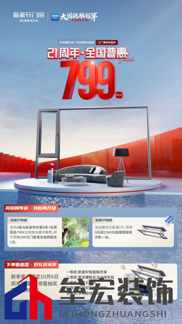 新豪軒21周年慶期間 不僅有799元鉅惠好窗亮相 更有新老客戶專屬福利放送 歡迎前往新豪軒門店咨詢 并鎖定10月6日周年慶直播 下單搶好窗 抽獎(jiǎng)贏大禮