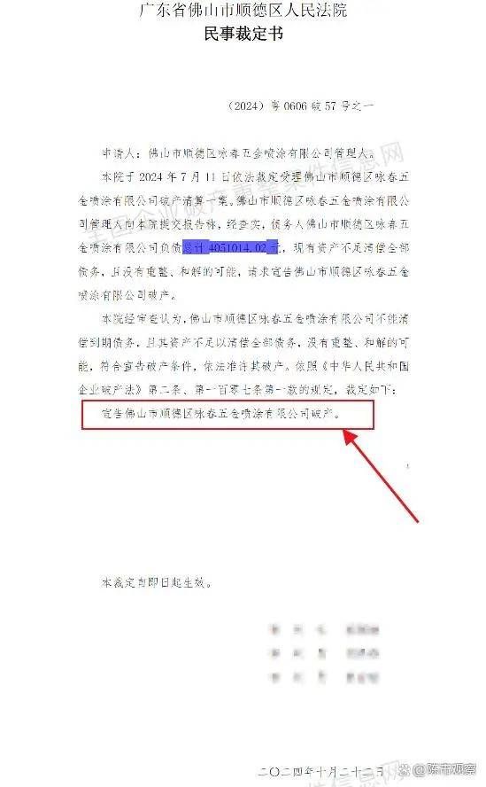 | 據(jù)消息顯示,佛山市順德區(qū)人民法院日前發(fā)布公告,以旗下資產(chǎn)無法覆蓋全部債務(wù)、且明顯不具備償債能力為由,裁定宣告佛山市順德區(qū)詠春五金噴涂有限公司(下稱“詠春五金”)破產(chǎn)。2024年7月11日,法院依法受理了關(guān)于“詠春五金”的破產(chǎn)申請,并指定了資產(chǎn)管理人。經(jīng)資產(chǎn)管理人核定,詠春五金已確認的負債額總計為4051014.02元人民幣,但其旗下資產(chǎn)已不足以償還全部債務(wù),且不具備償債能力、亦無和解之可能,符合破產(chǎn)條件。根據(jù)相關(guān)法律規(guī)定,佛山市順德區(qū)人民法院于2024年10月24日裁定宣告詠春五金破產(chǎn)。  自此,這家運作了17年的五金工廠徹底成為歷史,一批產(chǎn)業(yè)工人因此而失業(yè),著實令人唏噓。讓人想不到的是,一家注冊資金本僅有5萬元的五金企業(yè),最終負債竟高達400多萬,而隨著詠春五金的破產(chǎn),這筆債務(wù)可能再無化解的可能了。 公開資料顯示,詠春五金于2007年注冊成立,距今已有17年時間。詠春五金的主營業(yè)務(wù)為生產(chǎn)制造五金制品、電器零配件等產(chǎn)品的。雖然詠春五金的規(guī)模并不大,但其能連續(xù)運營17年,足以說明其產(chǎn)品得到了市場的驗證和認可。  然而,隨著內(nèi)外形勢的快速轉(zhuǎn)變,這家運作17年的五金工廠最終走到破產(chǎn)的地步。在其破產(chǎn)之前,詠春五金已被列入“經(jīng)營異常”、“失信被執(zhí)行人”名錄,處境之艱難由此可見一斑。 在業(yè)內(nèi)人士看來,由于受到下游需求持續(xù)萎縮等因素的影響,五金類制造業(yè)正面臨全方位挑戰(zhàn),曾經(jīng)“訂單接到手軟”的場景也一去而不復返,多數(shù)企業(yè)因訂單急速減少而陷入困難,減產(chǎn)、關(guān)停等情況屢見不鮮。在這個大背景下,一些大型五金制造企業(yè)憑借技術(shù)實力、資金充裕、市場和產(chǎn)品線多元化等優(yōu)勢,尚且可以保住市場份額,而中小微企業(yè)則處于苦苦支撐狀態(tài),稍有不慎將難以為繼。  此外,由于詠春五金的管理者缺乏對市場形勢的客觀判斷,導致其陷入盲目擴張的陷阱,進而導致其資金鏈完全斷裂,經(jīng)營難以為繼,負債400多萬則是詠春五金盲目擴張最好的證明,而資不抵債是詠春五金盲目擴張后所必然需要承擔的后果。  總的來看,詠春五金的破產(chǎn)已成為既定事實,難以改變。對于詠春五金的債權(quán)人來說,如何最大程度挽回損失,或成了最重要的問題。 來源:陳市觀察返回搜狐焦點首頁,查看更多 |