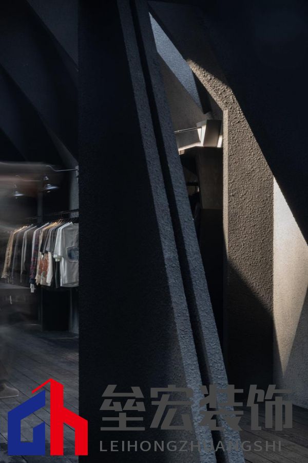 步入內(nèi)部,展陳系統(tǒng)亦延續(xù)品牌的設(shè)計邏輯:懸掛裝置模擬布料垂墜的動勢,陳列木盒的棱角呼應(yīng)服裝剪裁的鋒利線條。從宏觀空間到微觀產(chǎn)品,觀者皆能感知敘事的延續(xù),建筑形態(tài)與產(chǎn)品細節(jié)相互交融,使人與空間建立更深的情感聯(lián)結(jié)。