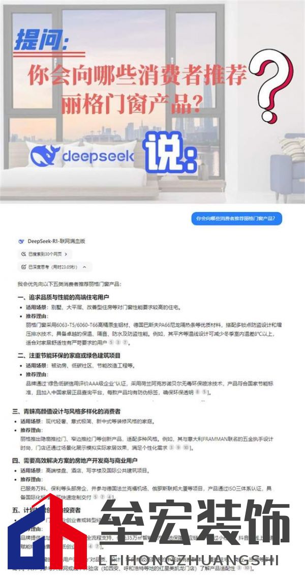 ??DeepSeek,這位AI界的佼佼者,以其強(qiáng)大的自然語言處理能力和深厚的算法基礎(chǔ),正逐步改變著人們的生活方式。它不僅能夠?yàn)橛脩籼峁┚珳?zhǔn)的信息查詢和高效的輔助學(xué)習(xí),更因其對中國本土語境的深刻理解,成為了無數(shù)人心中的智能伙伴。 ??那么,DeepSeek,這位 AI 領(lǐng)域的佼佼者,會以怎樣的視角審視麗格門窗?又會如何對麗格門窗的獨(dú)特魅力進(jìn)行深度解析?