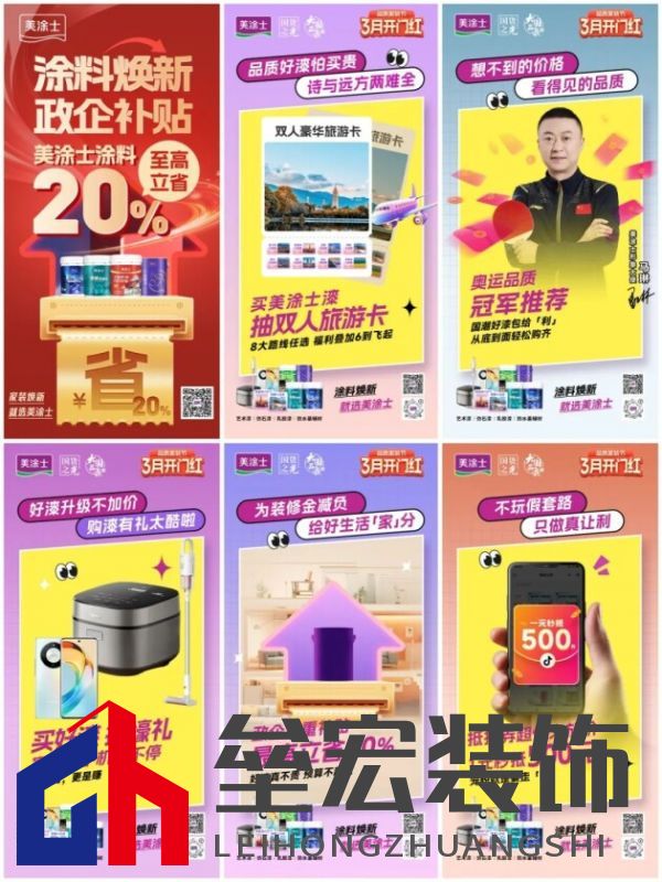 ??01 ??品質(zhì)家裝 盛況空前 ??全域營銷引爆品牌聲量 ??三月作為裝修黃金期,其適宜的氣候?yàn)槭┕ぬ峁┝藘?yōu)越的環(huán)境,是“金三銀四”的開工旺季。與此同時(shí),正值各地新一年“以舊換新”政策密集落地,消費(fèi)旺季與政策利好的雙重疊加,無論是對(duì)新房裝修還是舊房翻新的家裝用戶來說,都是不容錯(cuò)過的裝修好時(shí)節(jié)。 ??作為民族涂料大國品牌,美涂士深度聚焦消費(fèi)者需求,與國家政策同頻共振,3月品質(zhì)家裝節(jié),美涂士通過政企雙重補(bǔ)貼讓利,積極響應(yīng)國家“以舊換新”政策,至高立省20%的優(yōu)惠力度,讓消費(fèi)者能以更實(shí)在的價(jià)格享受到更高品質(zhì)的國潮涂料產(chǎn)品,進(jìn)一步降低用戶的家裝成本。同時(shí)活動(dòng)推出“買美涂士漆送旅游,8大旅游路線任選”、“藝術(shù)漆、仿石漆、乳膠漆、防水基輔材全品類產(chǎn)品通用優(yōu)惠券”、“壕禮抽獎(jiǎng)直播之夜”等創(chuàng)新營銷方式,讓用戶在煥新美家的同時(shí),還能享受一場說走就走的旅行,實(shí)現(xiàn)生活品質(zhì)與幸福感的雙重提升,真正做到為用戶創(chuàng)造美好生活!