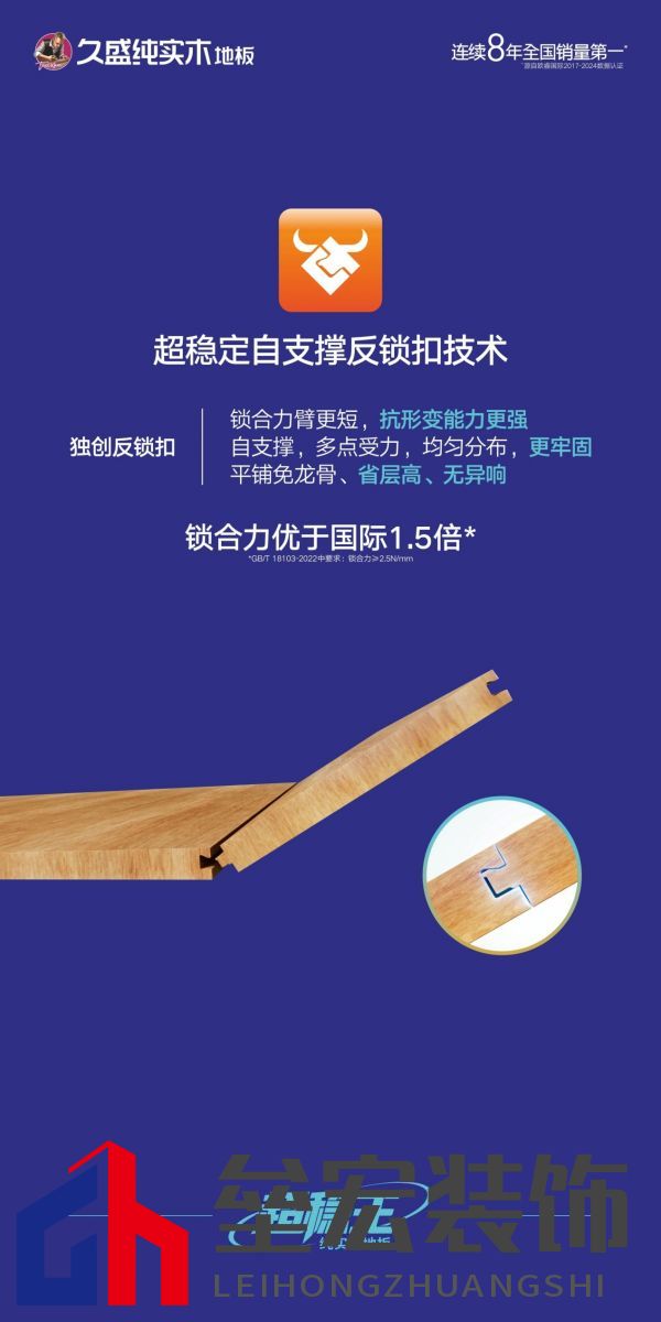 ??②超穩(wěn)定自支撐反鎖扣技術(shù): ??獨(dú)創(chuàng)反鎖扣結(jié)構(gòu),自支撐,多點(diǎn)受力,力度分布更均勻,著力點(diǎn)向上,支撐更牢固;無(wú)需使用龍骨、打釘、施膠粘結(jié)等其它輔助材料,大規(guī)格地板也穩(wěn)定,鎖合力優(yōu)于國(guó)標(biāo)1.5倍,為純實(shí)木地板平鋪戴上了“雙保險(xiǎn)”。