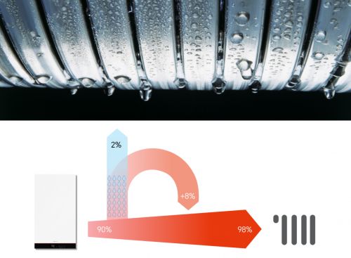 *次級冷凝原理圖 ??第二代冷凝爐——全預(yù)混冷凝技術(shù) ??全預(yù)混燃燒:燃?xì)夂涂諝?00%預(yù)先混合均勻,通過變頻風(fēng)機精確控制空燃比。這種方式燃燒更充分,熱效率高。 ??全冷凝回收:菲斯曼自主研發(fā)的優(yōu)質(zhì)鈦不銹鋼主熱交換器,將高溫?zé)煔饨禍刂谅饵c以下,回收潛熱。 ??相較常規(guī)壁掛爐,菲斯曼冷凝壁爐最高可達(dá)到98%(Hs高熱值)/108%(Hi低熱值)的標(biāo)準(zhǔn)利用率。