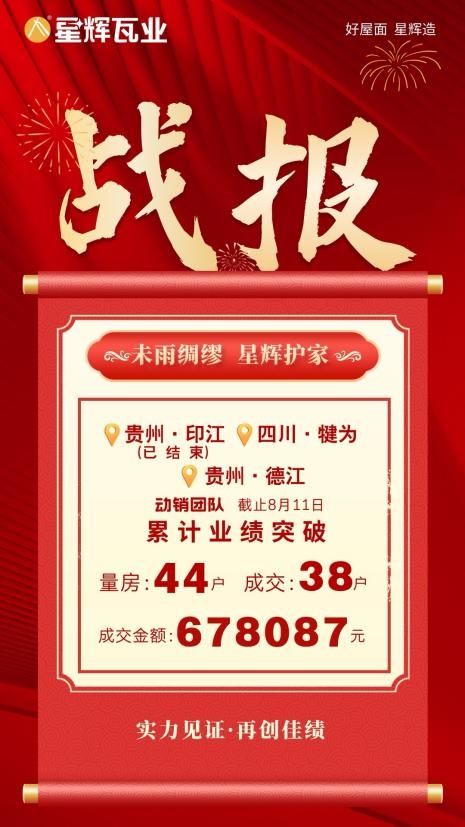 ??截止8月11日,星輝瓦業(yè)貴州印江、貴州德江、四川犍為專賣店在本輪活動(dòng)期間11天狂攬38單,簽單總額突破67萬(wàn)元,再次取得活動(dòng)的階段性勝利。這場(chǎng)以“服務(wù)力+產(chǎn)品力+品牌力”為內(nèi)核的終端服務(wù)戰(zhàn)役,不僅為各地經(jīng)銷商注入增長(zhǎng)強(qiáng)心劑,更是將星輝瓦業(yè)的“品質(zhì)”和“口碑”深植多地用戶心中。 ??活動(dòng)期間,在總部支持下,星輝瓦業(yè)各地專賣店以“產(chǎn)品大促+工廠補(bǔ)貼+惠民好禮”三重促銷組合拳,重磅推出“榮耀三十年—屋面翻修百萬(wàn)補(bǔ)貼服務(wù)節(jié)”大型終端促銷活動(dòng),并免費(fèi)提供房屋勘測(cè)服務(wù),全面讓利終端用戶。