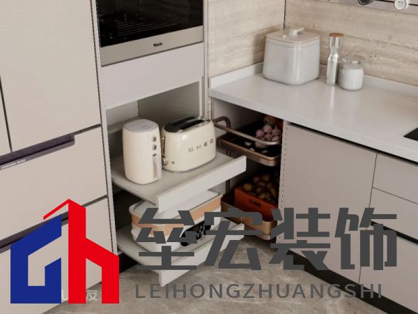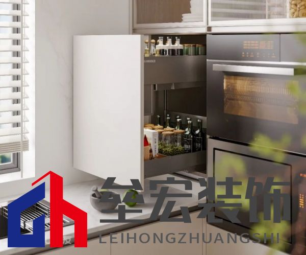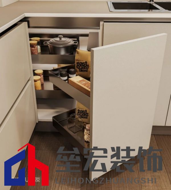 ??③轉(zhuǎn)角柜 ??廚房轉(zhuǎn)角區(qū)域常常被浪費(fèi),但只要配置一個(gè)轉(zhuǎn)角拉籃,用來(lái)收納鍋具等大件物品,這片死角就能被充分利用起來(lái)。
