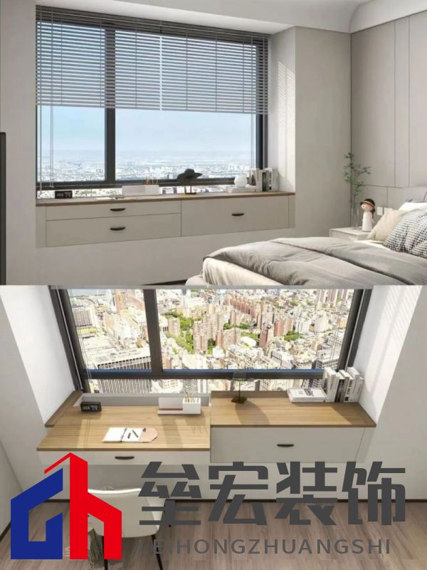 ??②飄窗柜 ??除此之外,閑置的飄窗也能巧妙利用起來(lái)。在飄窗處設(shè)計(jì)可推拉的抽屜桌面,平時(shí)推回不占過(guò)道空間,需要時(shí)拉出即可作為書(shū)桌或梳妝臺(tái)使用,1㎡都不浪費(fèi)~